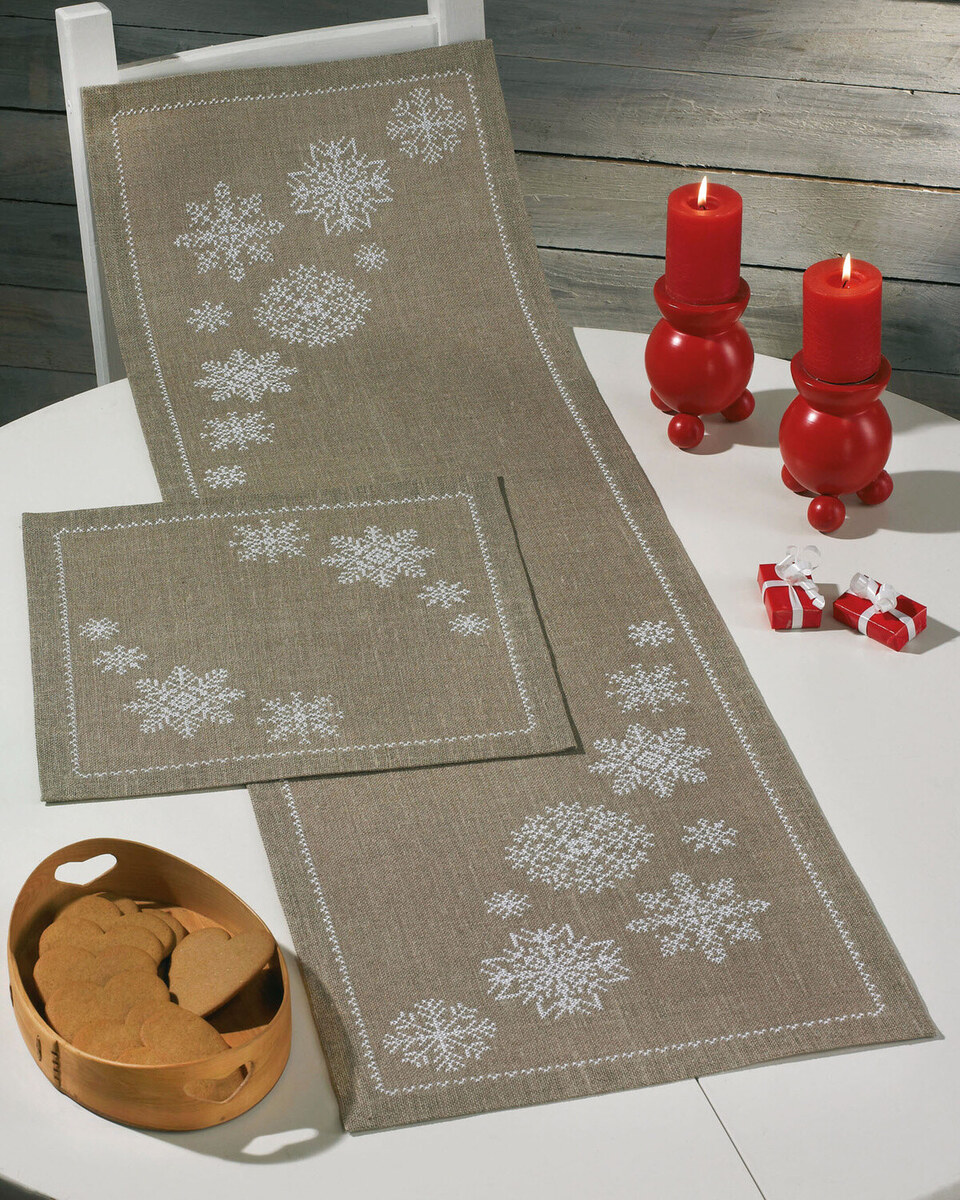 Ontdek de magie van de winter met ons prachtige borduurpakket "Sneeuwvlok op linnen". Het prachtige motief toont het delicate patroon van sneeuwvlokken die zachtjes neerdalen tegen een achtergrond van natuurlijk linnen. Dit elegante ontwerp brengt een winterse charme in elke ruimte. Het meet 38x122 cm en is ideaal voor degenen die oog hebben voor gedetailleerd vakmanschap.