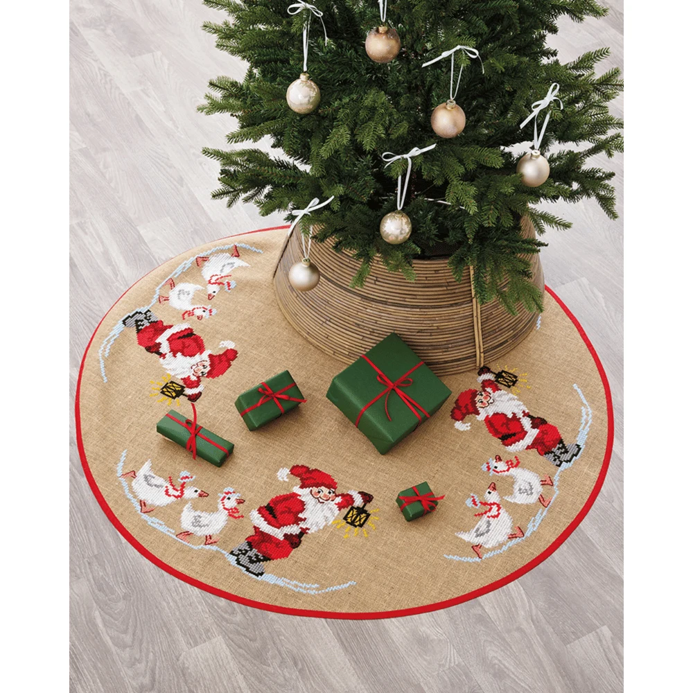 Sfeervol borduurpakket met een klassiek kerstmotief van de kerstman en ganzen. Het pakket wordt geborduurd met kruissteek en stiksteek op stevig jute.