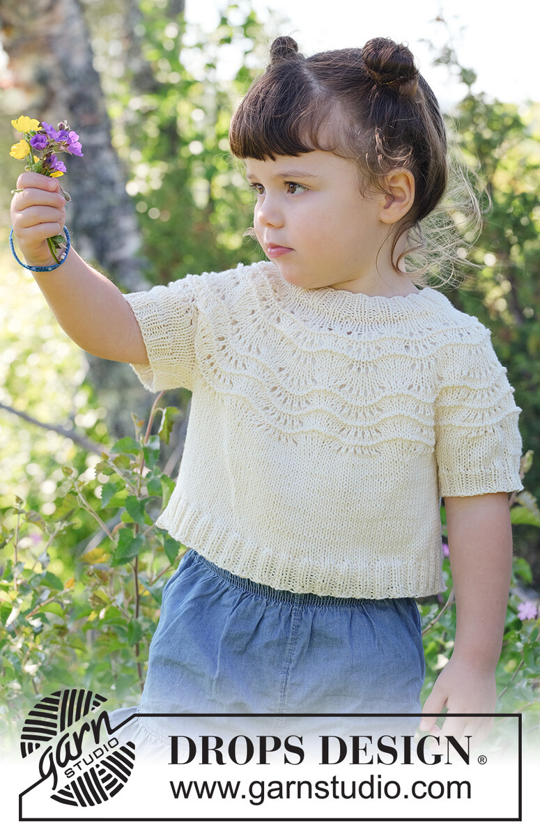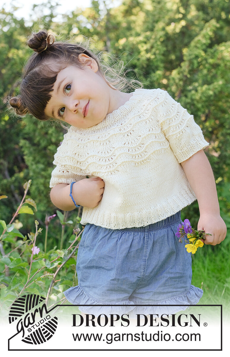 Gebreide, korte trui voor kinderen in DROPS Safran of DROPS Baby Merino. Het werk wordt van boven naar beneden gebreid met ronde pas en golfpatroon. Maat 2 - 12 jaar