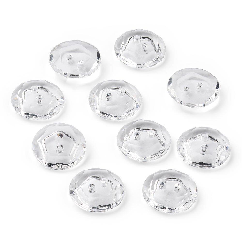 Een set van 10 transparante kristalknopen van kunststof, elk met een diameter van 12 mm. De gefacetteerde afwerking vangt het licht prachtig op en geeft je project een elegante uitstraling.