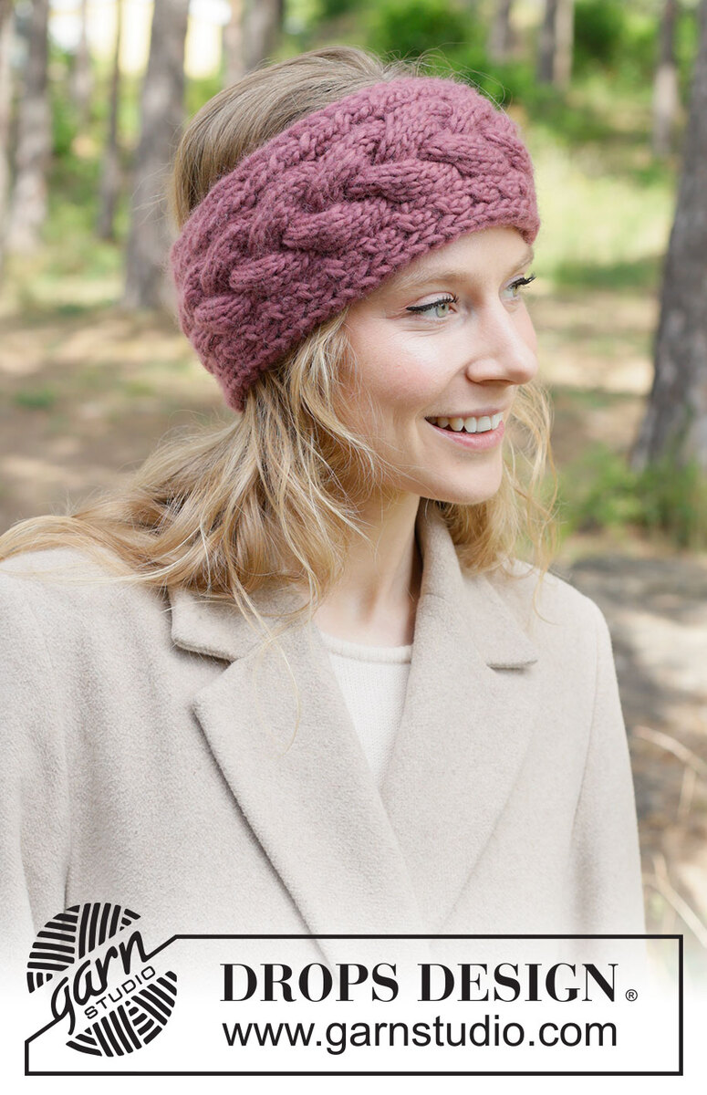 Gebreide hoofdband in DROPS Snow. Het werk wordt overdwars gebreid met kabels.