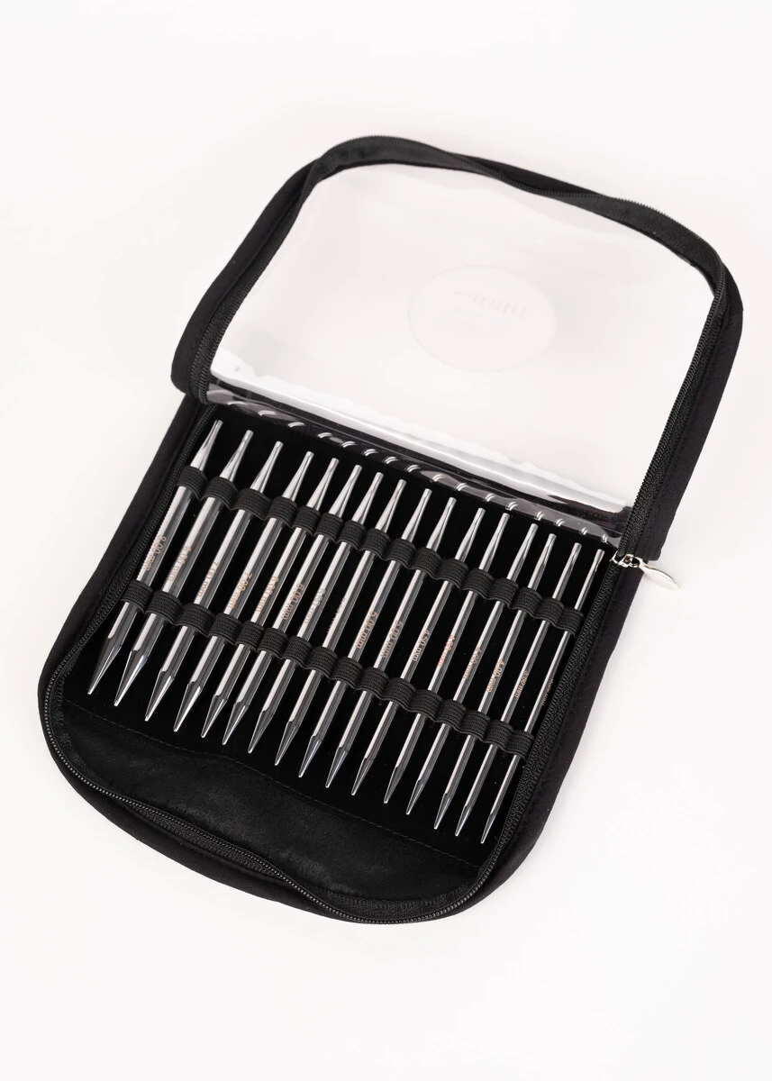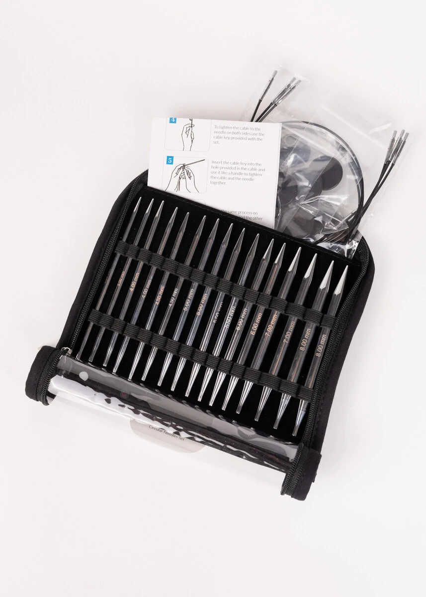 De set wordt geleverd in een praktisch textielen etui met een transparante vinyl voorkant, zodat je gemakkelijk overzicht houdt over je naalden en accessoires. De verwisselbare naalden worden eenvoudig op de kabels geschroefd, zodat je verschillende maten en lengtes kunt combineren afhankelijk van je project.