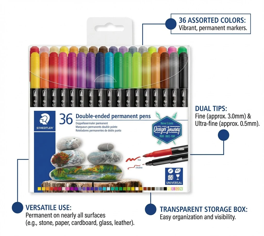 Met STAEDTLER® 3187 krijg je een veelzijdige set permanente dubbelpuntstiften die zowel snelle markeringen als creatieve detaillering aankan. Twee punten per pen zorgen voor hoge functionaliteit en de 36 kleuren geven je volop mogelijkheden om je stijl te variëren. Als je duidelijke lijnen wilt en een set die op veel oppervlakken gebruikt kan worden, is dit een veilige keuze voor je volgende project.