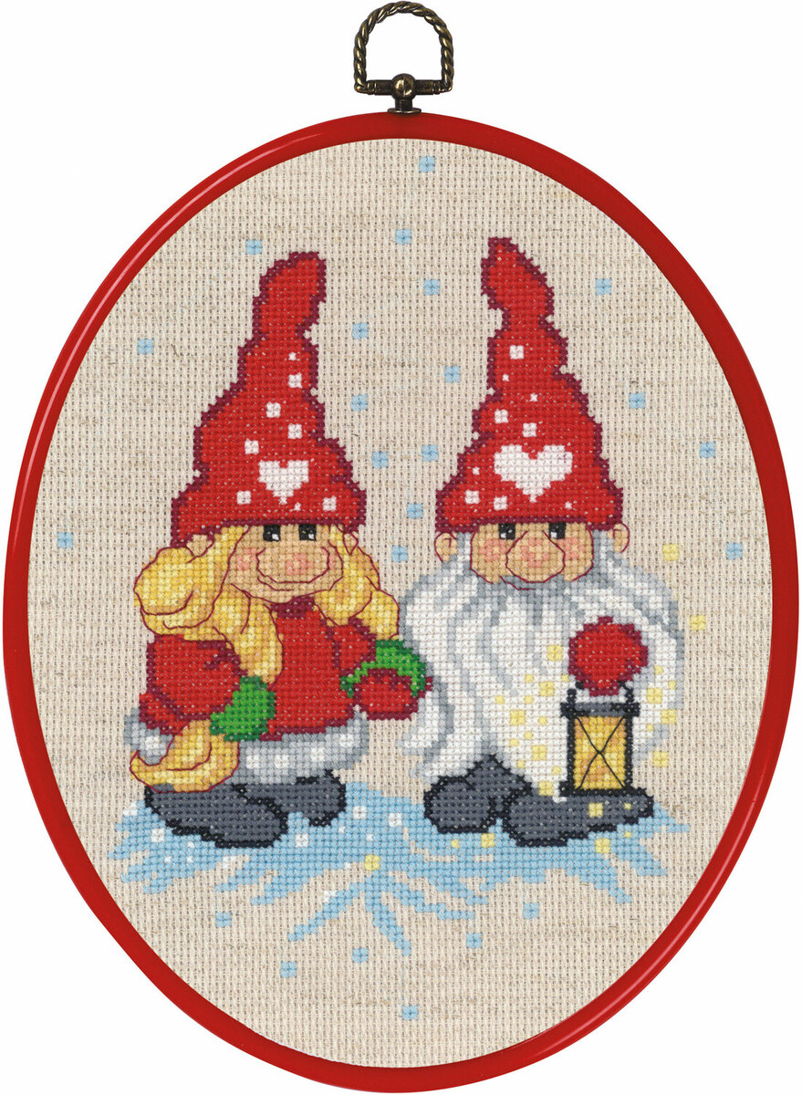 Ervaar de magische sfeer van winter en kerst met onze charmante borduurset 'Koppel van kabouters/lantaarn'. Dit prachtige motief toont een vriendelijk koppel kabouters in een warme omhelzing, verlicht door een stralende lantaarn, terwijl ze in het met sneeuw bedekte landschap staan. De details in deze set brengen het gezellige en feestelijke karakter naar voren dat perfect past bij de vreugden van kerst.